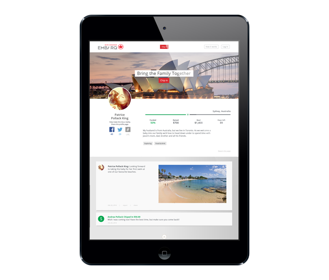 This is someone's Embarq page. Once here, visitors can chip in to their flight, or look at their trip details and timeline.